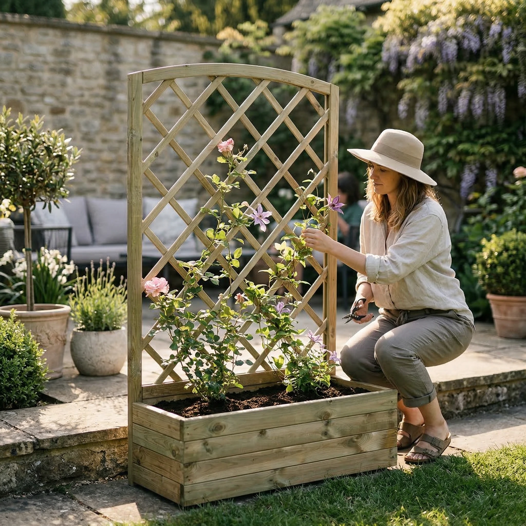 Jakie rośliny najlepiej sprawdzą się w tej donicy z kratą? Donica z kratą i łukiem doskonale sprawdzi się dla wszelkich roślin pnących, takich jak róże, powojniki, bluszcze, groszki pachnące, a także warzyw pnących (np. ogórki, fasola). Krata zapewnia im idealne wsparcie do wzrostu.