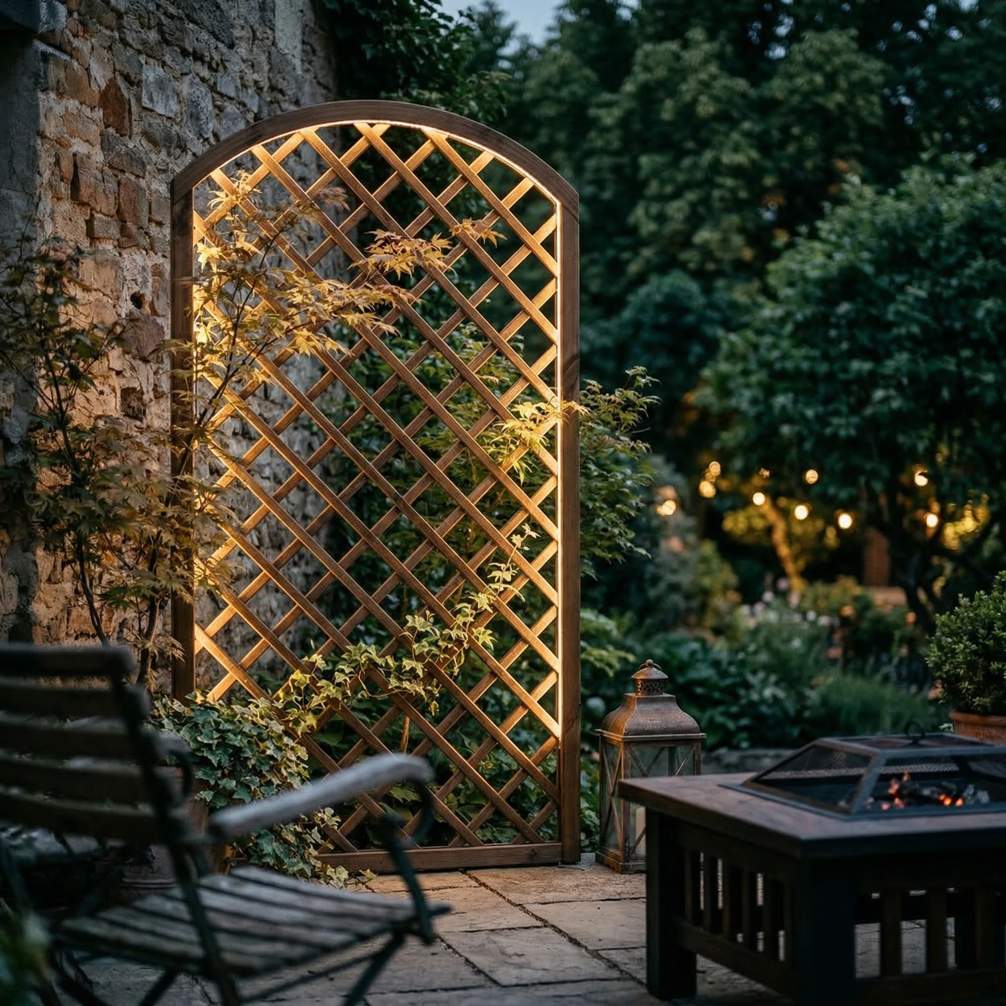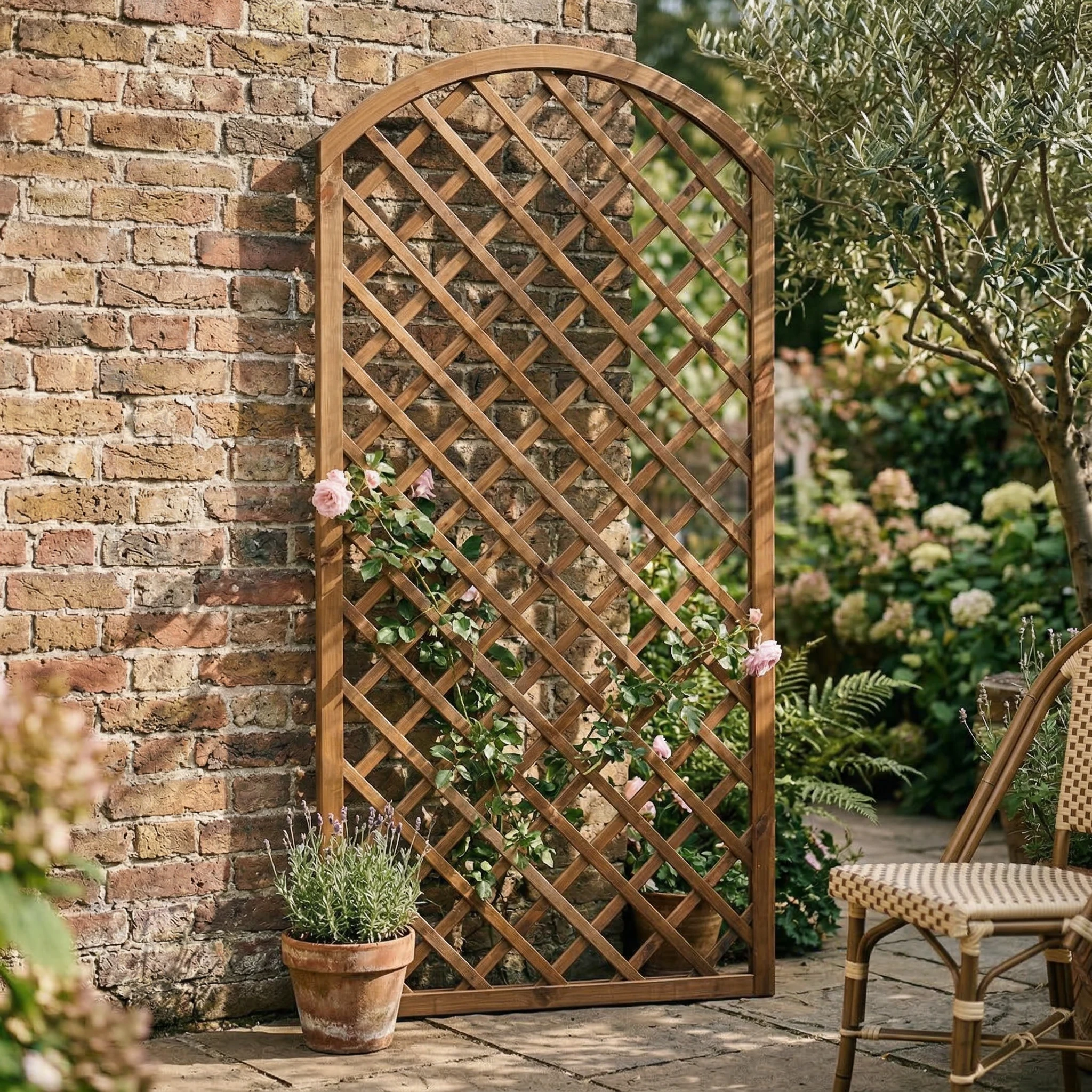 Brązowa krata skośna z łukiem: idealna do ogrodu i pnączy.