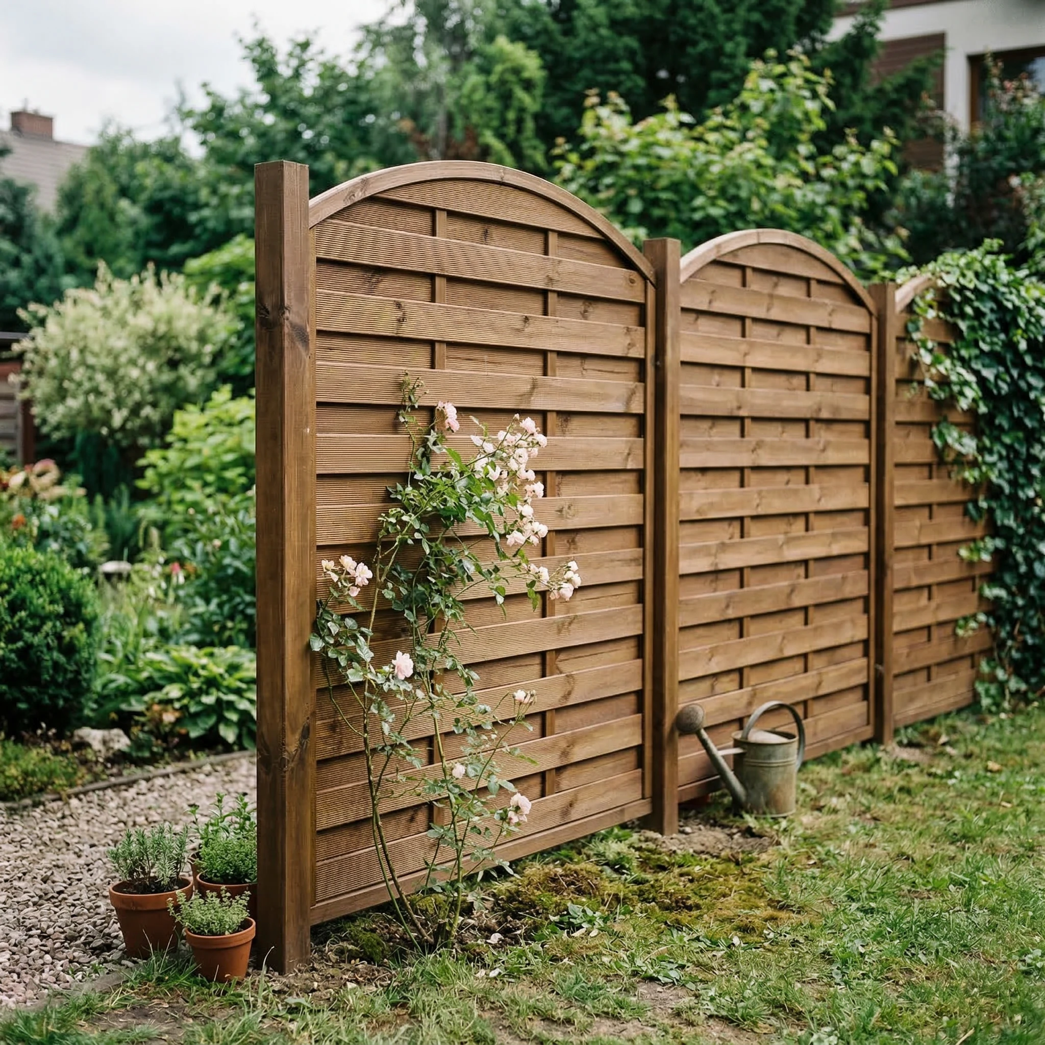Przedstawiamy płot osłonowy pełny z eleganckim łukiem, który rewolucjonizuje sposób, w jaki postrzegasz swoją przestrzeń ogrodową. Ten solidny element ma wymiary 90 cm szerokości oraz 180/160 cm wysokości, co czyni go idealnym rozwiązaniem do stworzenia intymnego kącika lub wyraźnego podziału stref. Zastosuj go, aby wydzielić strefę relaksu z leżakami, oddzielić kącik grillowy od reszty ogrodu, lub stworzyć bezpieczną przestrzeń do zabawy dla dzieci.